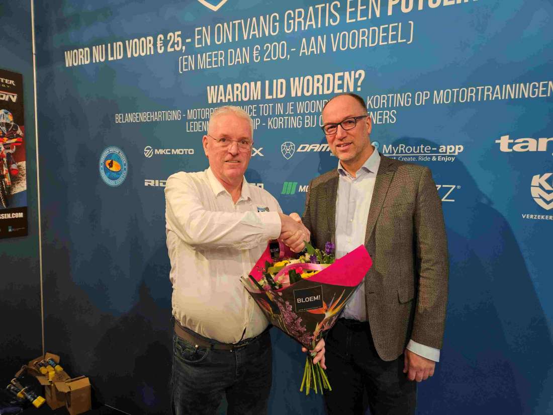 De Stichting Vrienden TT Circuit Assen hoopt dat Wim Mulder een positieve bijdrage aan haar activiteiten kan leveren en omgekeerd zal onze stichting diverse activiteiten die de KNMV ontplooit onder de aandacht brengen van haar Vrienden. Op de foto’s Wim Mulder (rechts) die bloemen van Jan Pras ontvangt in de stand van de KNMV op de Motorbeurs Utrecht. Op de foto onder is tussen beide heren de poster te zien van de Motocross of Nations, die in 2027 weer op het TT Circuit wordt gehouden. Het is de unieke wedstrijd motorcross om de officiële wereldtitel voor landenteams. (Foto: Vrienden TT / Fred Lubbers)